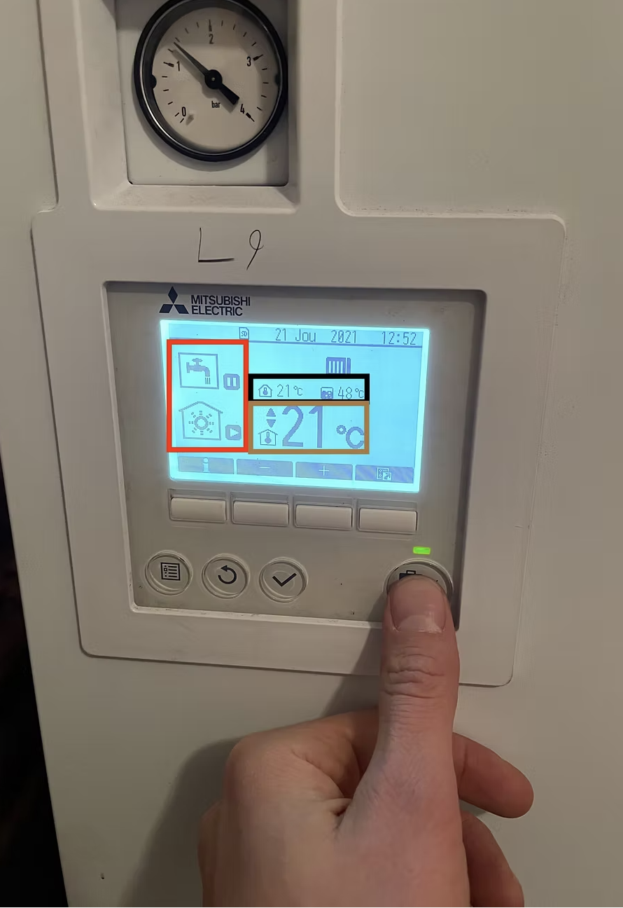 Näytön päällä oleva painemittari näyttää lämmitysverkoston paineen.
